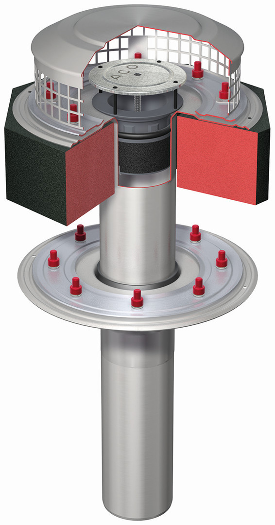 ACO Brandschutz-Flachdachablauf Spin Schaumglas beheizt, DN 100, Edelstahl-Kiesfangkorb, 90Grad AO13112890