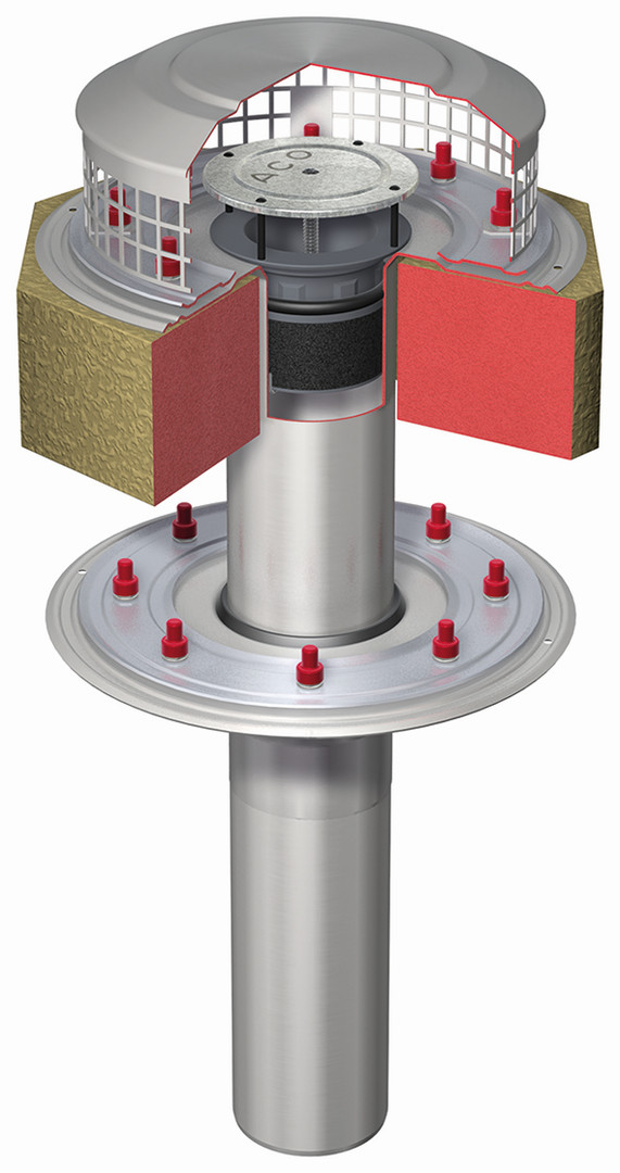ACO Brandschutz-Flachdachablauf Spin Schaumglas beheizt, DN 100, Edelstahl-Kiesfangkorb, 90Grad AO13112890