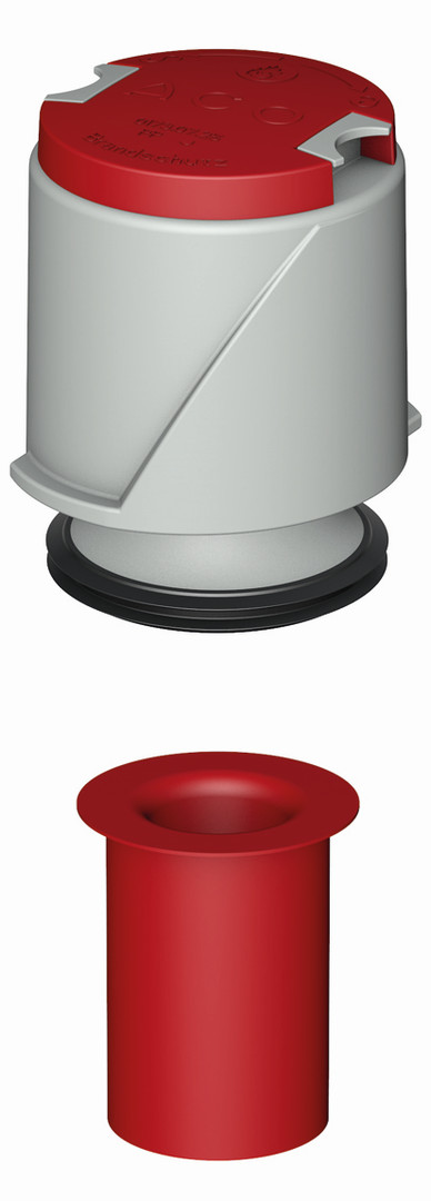 Feuer- und Rauchverschluss zur nachträglichen Brandschutz- Ausrüstung von Ablaufkörpern, bestehend aus: Geruchsverschluss mit Hitzeschild, Brandschutz- Kartusche, Brandprüfungen bestanden: AbZ beantragt