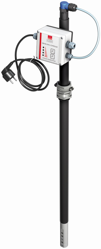 zur elektronischen Messung der Fettschicht, geeignet für flüssige und/oder aushärtende Fette, Auswertegerät mit steckerfertigem Anschlusskabel, Länge: 3 m, mit 2 potentialfreien Wechslerkontakten zur Anzeige Vollmeldung (80 %) und der Vorwarnung des Vollzustandes (50 %), mit optischer Anzeige des Füllstandes, mit beheiztem Sondenstab zur Erhöhung der Betriebssicherheit, Betriebsspannung: 230 V/5 VA, max. Verbrauch ca. 12 W