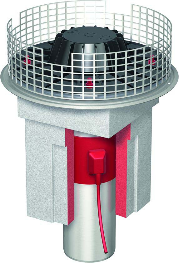 ACO Flachdachablauf Jet Styropor beheizt, DN 100, Edelstahl-Kiesfangkorb, 230 x 360 mm, 90Grad