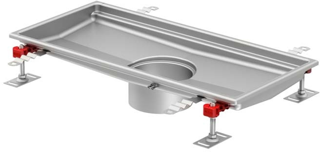 orbital geschweißter Rinnenstutzen, tiefgezogene Eimerauflage und Endstücke, werkseitige Hohlraumverfüllung, Gefälle in Längs- und Querrichtung, große Radien, Materialdicke 1,5 mm, mit Mauerankern, mit Höhenjustierfüßen, mit herausnehmbaren Schmutzfang