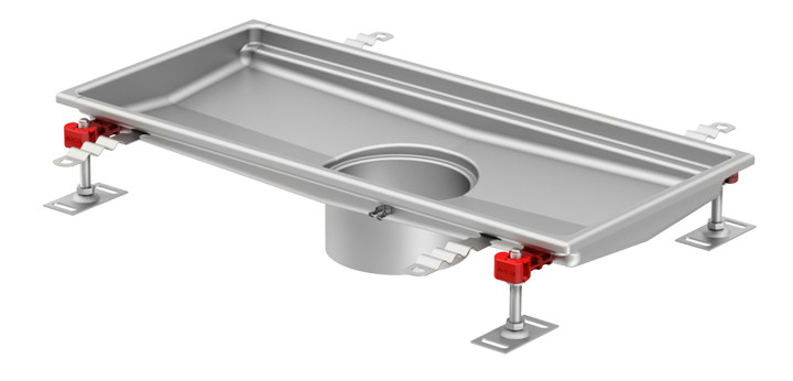 orbital geschweißter Rinnenstutzen, tiefgezogene Eimerauflage und Endstücke, werkseitige Hohlraumverfüllung, Gefälle in Längs- und Querrichtung, große Radien, Materialdicke 1,5 mm, mit Mauerankern, mit Höhenjustierfüßen, mit herausnehmbaren Schmutzfang