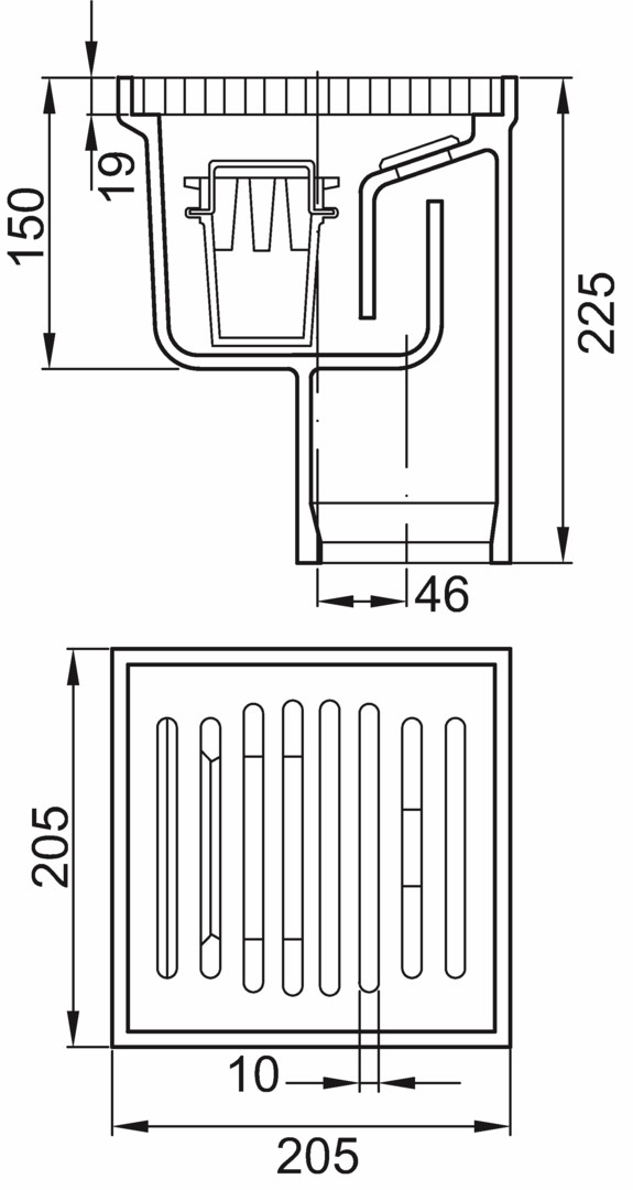 geprüft gem. DIN EN 1253, Kellerablauf Schlitzrost mit Anstrich, mit Eimer in schwarz, aus PE hart, Abflusswert 2 l/s, Baustoffklasse A1, für Anschluss an SML Rohr geprüft gem. DIN 19522/DIN EN 877