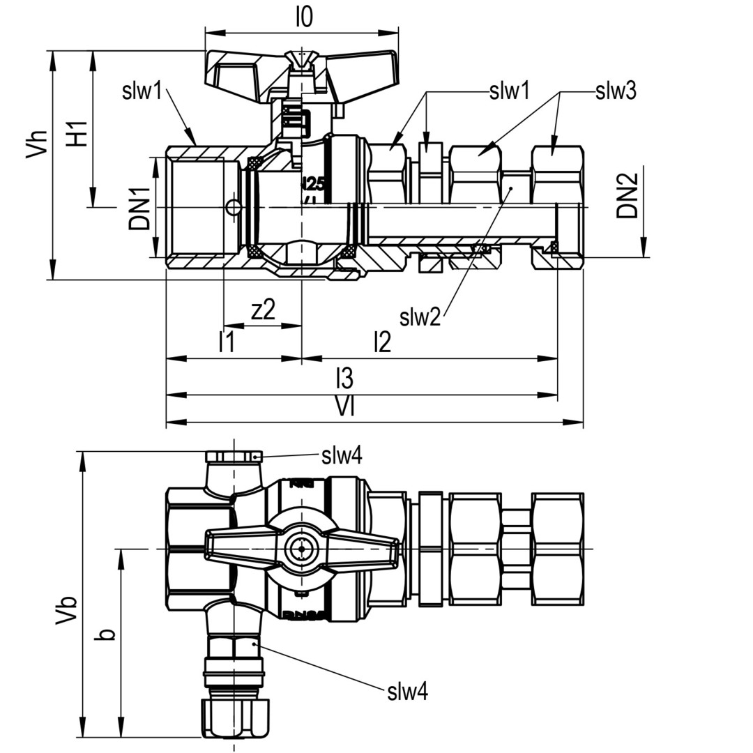 AIPS Ausgangsventil-Kugelhahn SEPP Aqua 1616.55 DN 25 - Q3 4, Messing, mit Schiebetülle, mit Entleerung