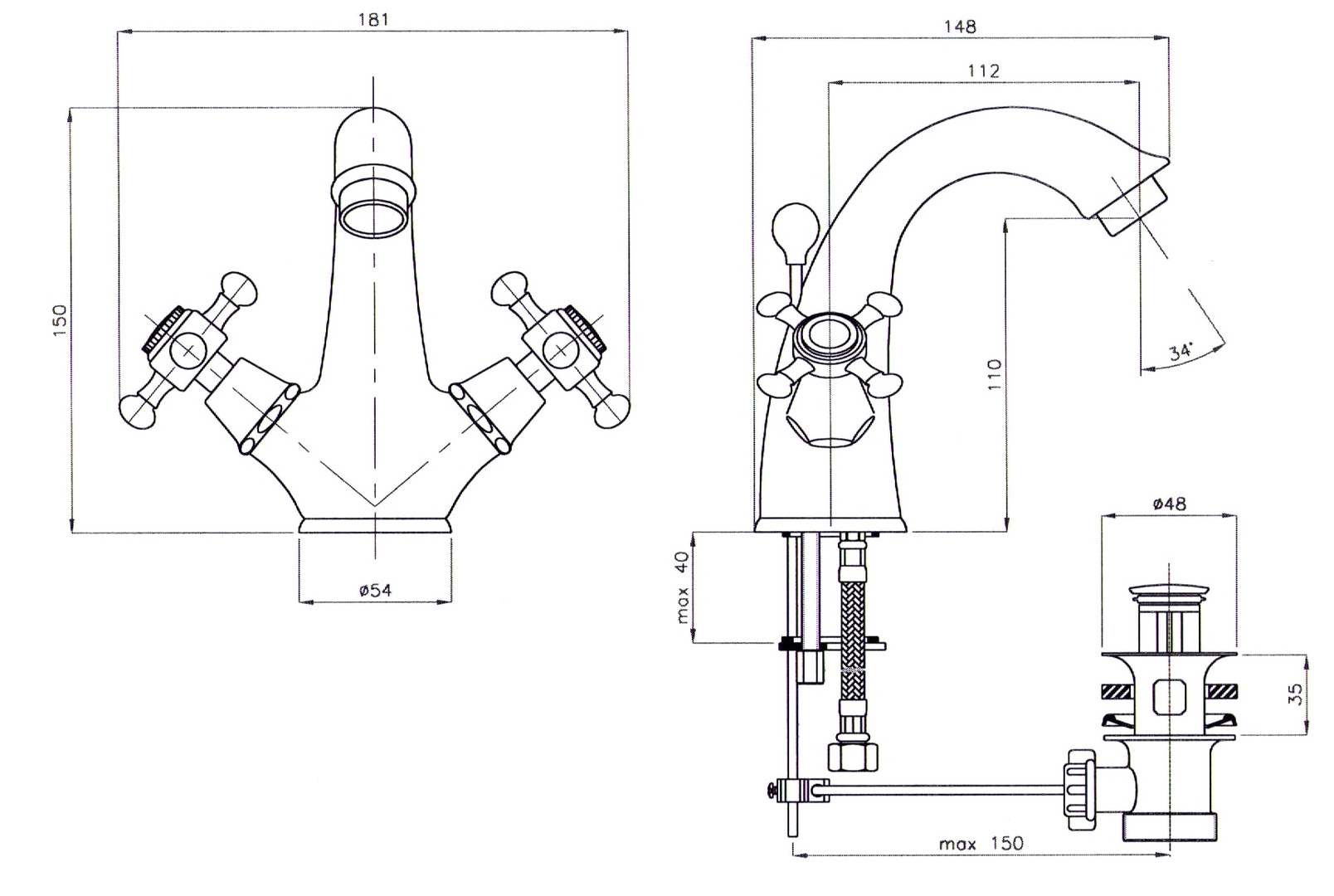 AQVAZONE Waschtisch-Zweigriff-Armatur AQVA RETRO I chrom, mit Ablaufgarnitur