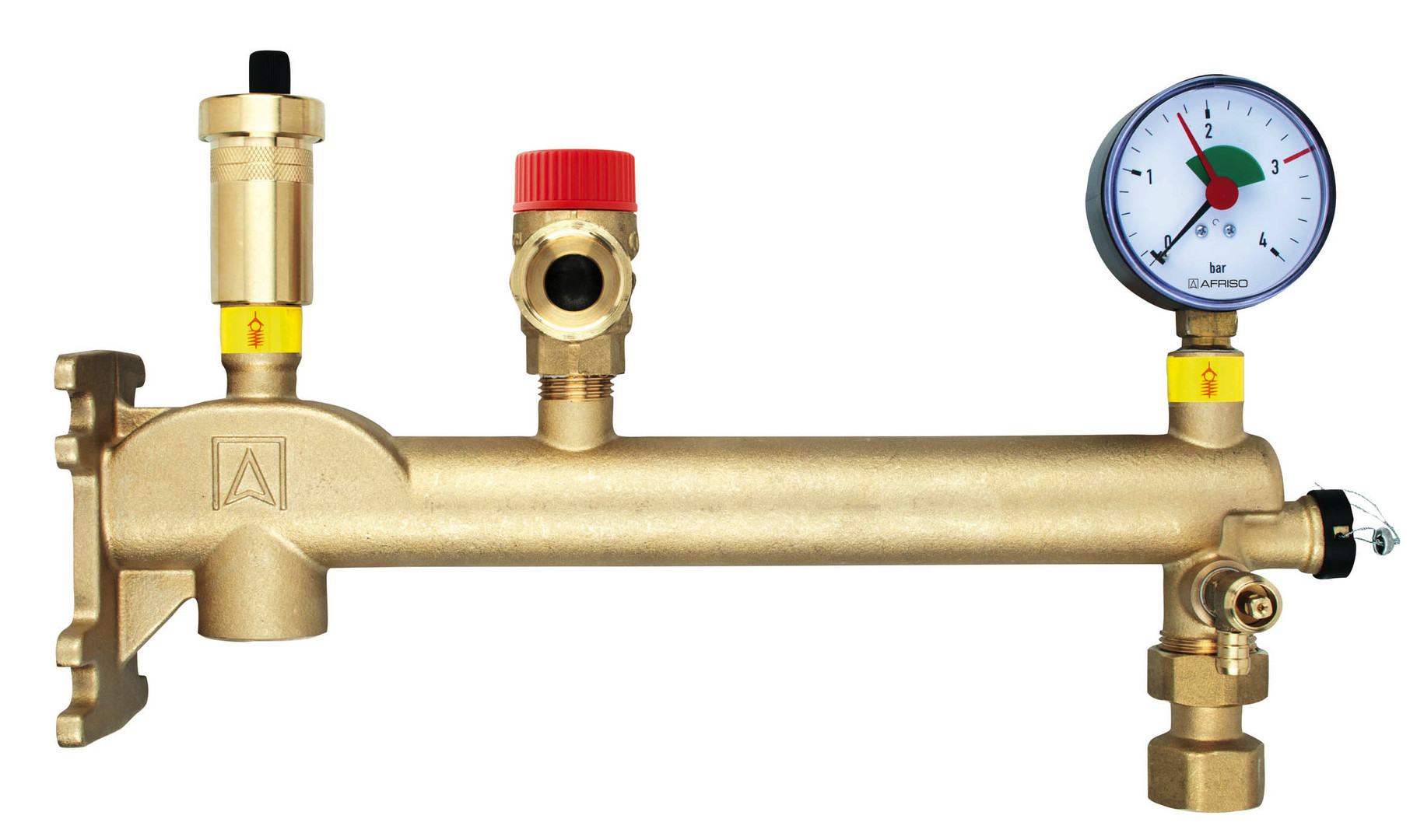 zum Anschluss von Membranausdehnungsgefäßen bis 50 l für geschlossene Heizungsanlagen nach EN 12828 bis zu einer Leistung von 50 kW, vormontierte Kombinationsarmatur bestehend aus Armaturenträger aus massivem Messingguss mit integriertem Kappenventil zum Anschluss des Membranausdehnungsgefäßes, bauteilgeprüftem Sicherheitsventil, Heizungsmanometer mit rotem Markierungszeiger, montiert über selbstdichtendem Montageventil, Schnellentlüfter (12 bar) montiert über selbstdichtendem Montageventil, zwei Isolationshalbschalen, Anschlüsse Kessel G 3/4 Innengewinde, Ausdehnungsgefäß G 3/4 Innengewinde, Temperatureinsatzbereich Medium max. 120 °C, Maße (mit Isolation) 360 x 185 x 100 mm, Isolation Polypropylen EPP, Armaturenträger Messing (Ausladung 300 mm), Membran-Sicherheitsventil MS (Eingang x Ausgang G 1/2 x G 3/4, Dichtung PTFE-Ring drehbar eingedichtet, Ansprechdruck 3 bar), Wärmeleistung 50 kW, Rohrfedermanometer mit selbstdichtendem Montageventil, Anzeigebereich 0/4 bar (mit rotem Markenzeiger), Ø 63 mm-G 3/8 Rad, Schnellentlüfter mit Aquastop (Eingang G3/8, Nenndruck 12 bar), mit GAK und Montagezubehör