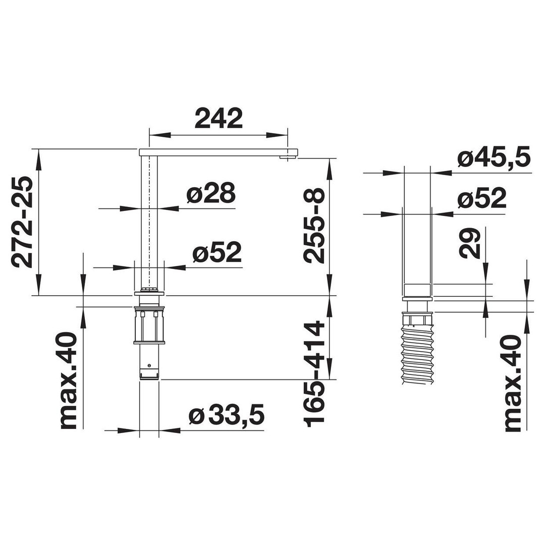 für die Montage vor dem Fester, von Hand versenkbar, 3 cm Mindestabstand zwischen Spüle und Fensterflügel erforderlich, 11,5 l/min bei 3 bar Druck, hoher Auslauf 360° schwenkbar, 2x Ø 35 mm benötigte Hahnlochbohrungen für Armatur und Bedienhebel, mit Keramik-Scheibenkartusche, patentierter Strahlregler, patentierter Strahlregler, flexible Anschlussrohre mit 700 mm Länge und 3/8" Mutter, Stabilisierungsplatte, nicht kompatibel mit IF/A-Modellen