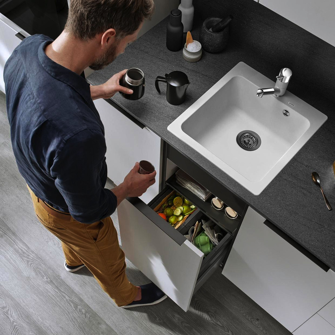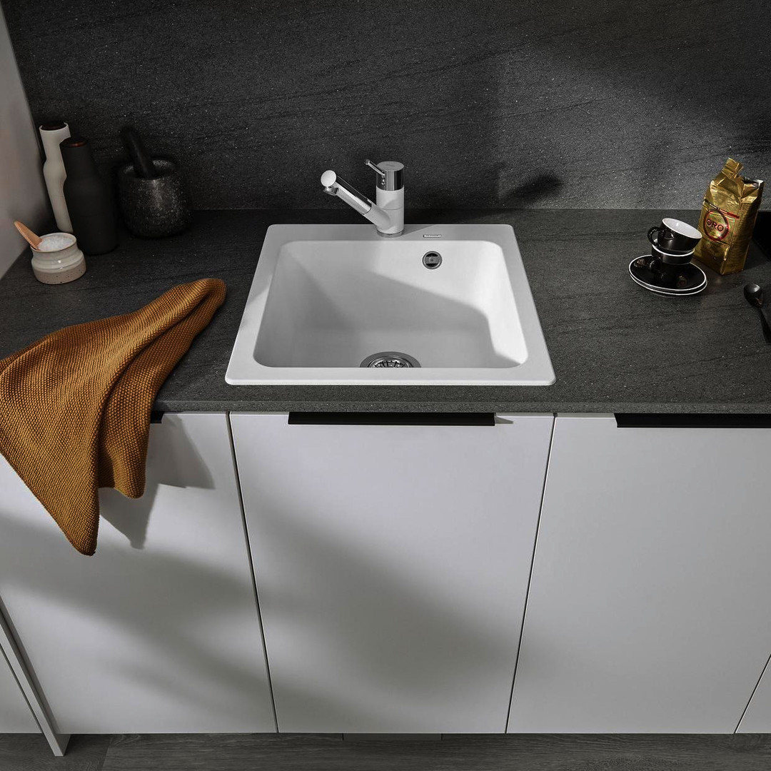 Beckentiefe 20 cm, sanfte Eckradien im Spülbecken, der Rand umgibt den Wasserbereich und schützt die Arbeitsplatte vor Spritzwasser, Ablaufgarnitur mit Raumsparrohr, 3 1/2" Korbventil, Einbau von oben, Untermaß 45 cm