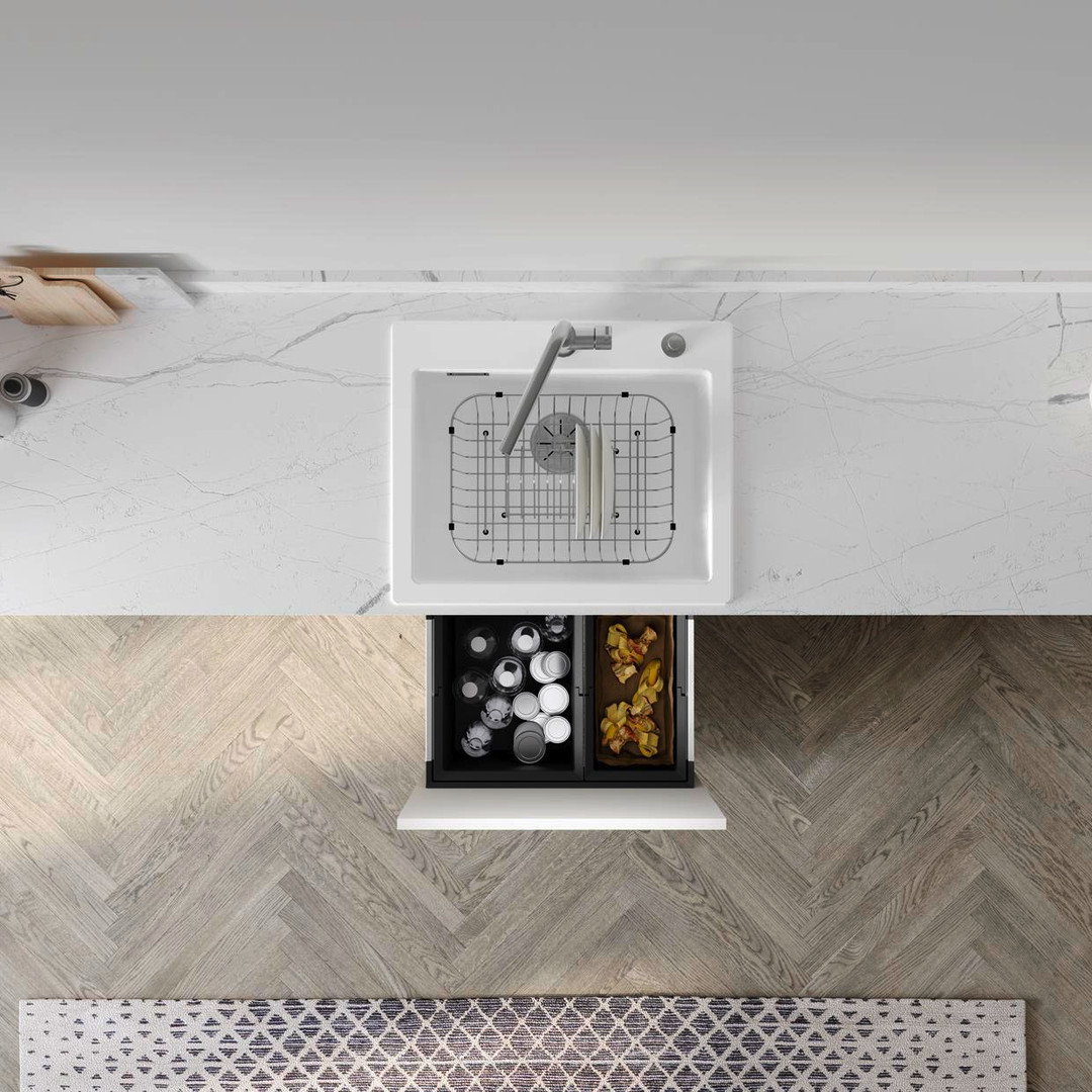 Beckentiefe 19 cm, flache Randgestaltung, mit verdeckten C-overflow und dem Ablaufsystem InFino, Ablaufgarnitur mit Raumsparrohr, 3 1/2‘‘ InFino-Korbventil mit Ablauffernbedienung (Zugknopf), Einbau von oben, Unterschrank 60 cm