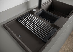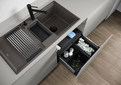 Beckentiefe 20/13,5 cm, XL-Becken in Kombination mit Ablauf und ebener Abtropffläche, mit multifunktionale ADIRA-Klappmatte, Multifunktionsschale aus Kunststoff, Ablaufgarnitur mit Raumsparrohr, 2x 3 1/2“ InFino-Korbventil mit integrierter Ablauffernbedienung (Drehknopf) für das Hauptbecken, Einbau von oben, Untermaß 60 cm