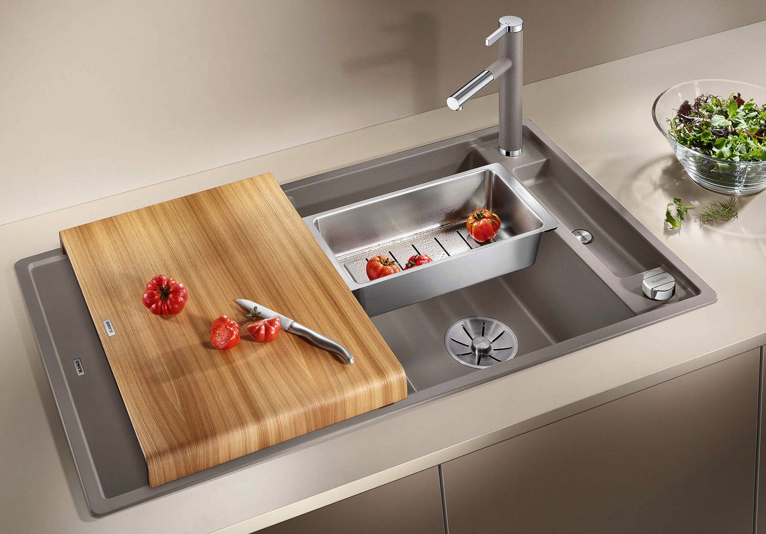 Becken-Tiefe 19 cm, Esche-Compound-Brückenschneidbrett, Ablaufgarnitur mit Raumsparrohr, 3 1/2“ InFino-Korbventil, Ablauffernbedienung (Drehbetätigung)