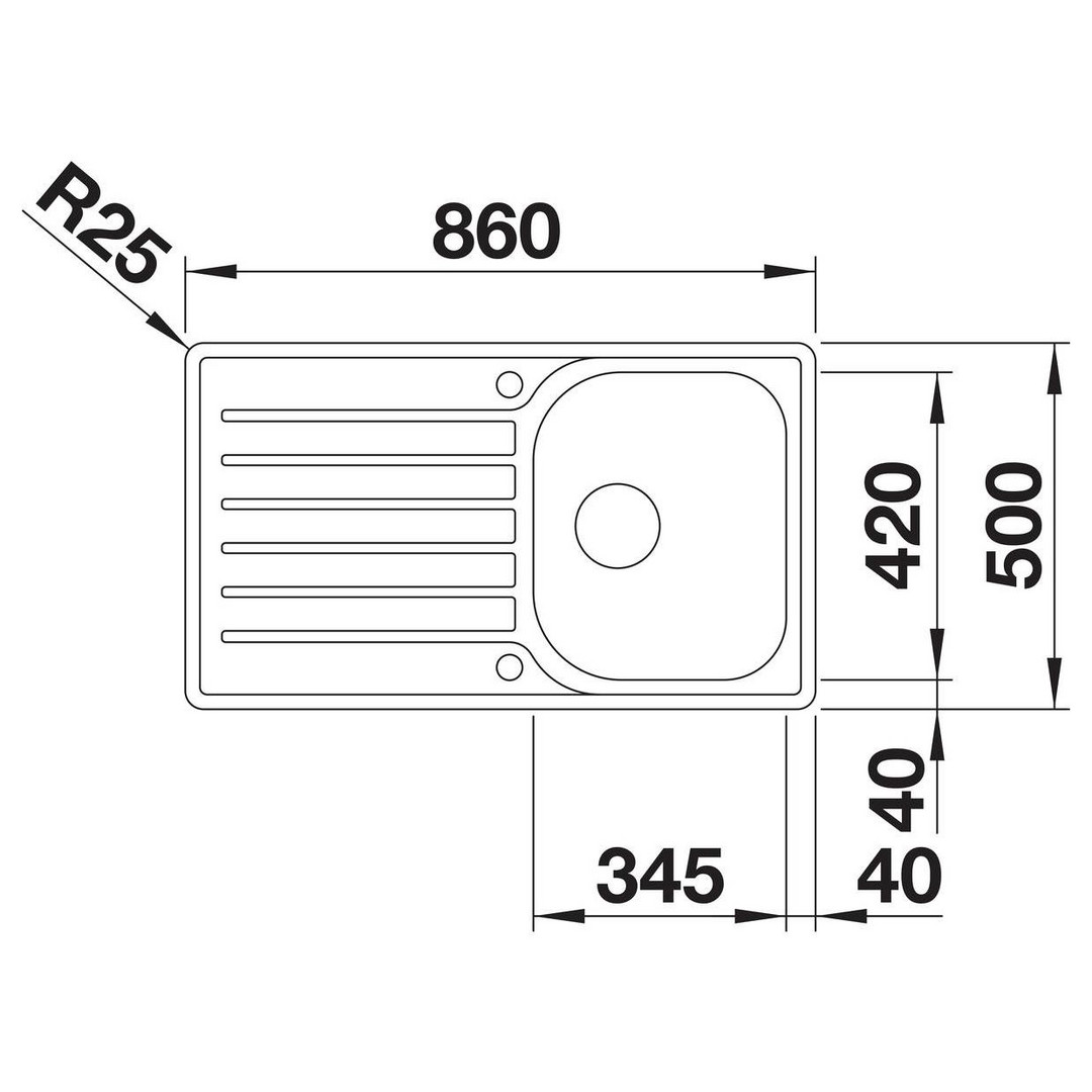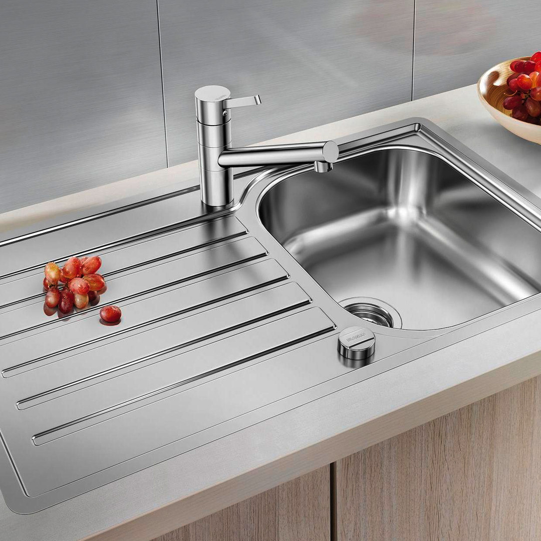 Beckentiefe 16,5 cm, Abtropffläche mit Zusatzausguss, Ablaufgarnitur mit Raumsparrohr, 3 1/2" Korbventil mit Ablauffernbedienung (Drehbetätigung), reversibel einbaubar, IF-Flachrand für den flächenbündigen und aufliegenden Einbau, Untermaß 45 cm