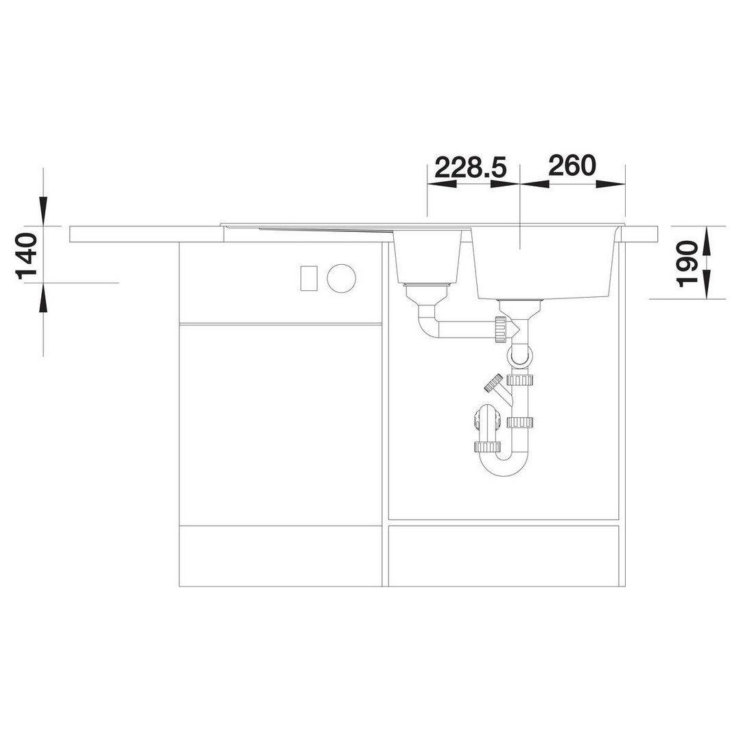 Beckentiefe 19/14 cm, schmaler Rand, mit Batteriebank (vergrößert als Rahmen die Abtropffläche), zusätzliches Becken mit Korbventil, Ablaufgarnitur mit Raumsparrohr, 2x 3 1/2" Korbventil mit integrierter Ablauffernbedienung (Drehknopf) für das Hauptbecken, Einbau von oben, Untermaß 60 cmm