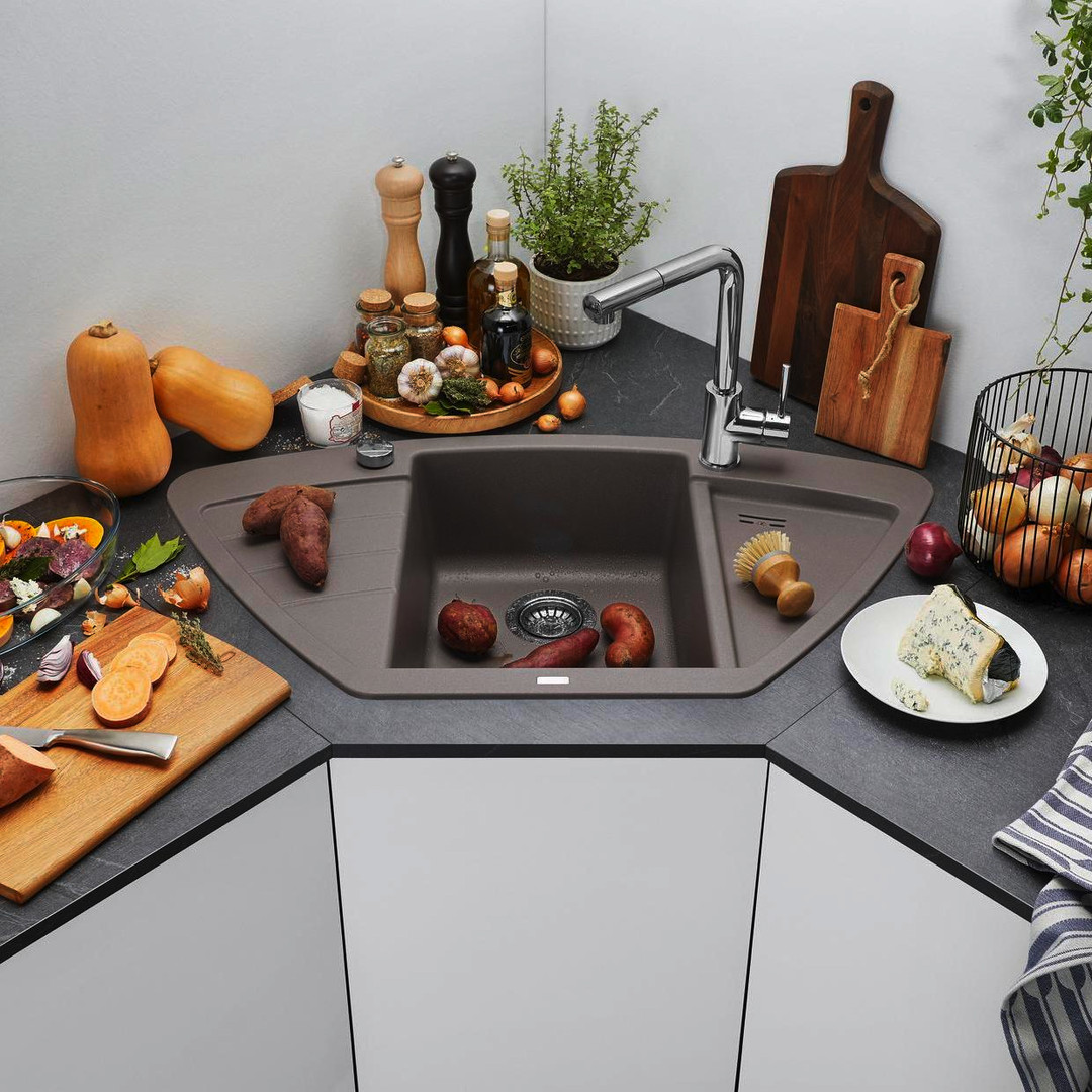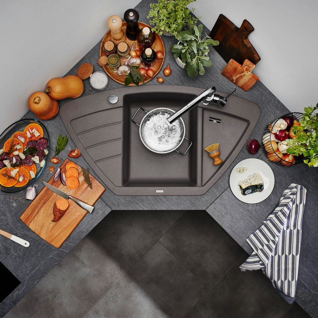 Beckentiefe 18/2,7 cm, Ablaufgarnitur mit Raumsparrohr, 3 1/2" Korbventil mit integrierter Ablauffernbedienung (Drehknopf), Becken mittig, kompakte Abtropffläche, vertiefte Ausgusszone, für Eck- und Zeileneinbau geeignet, Einbau von oben, Eck-Maß 90 x 90 cm