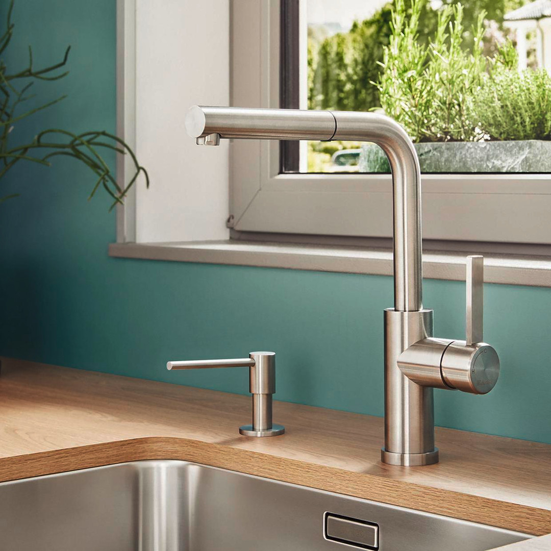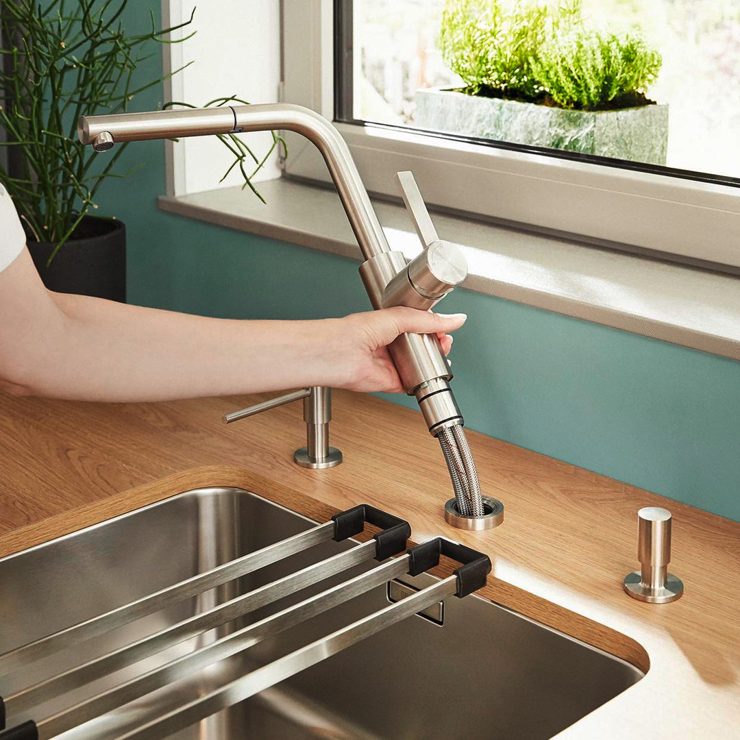 zur Installation vor einem Fenster, aus massivem Edelstahl, herausziehbarer Auslauf, größere Gestaltungsmöglichkeit bei Einbau vor Rückwand durch Bedienhebel mit senkrechter Nullstellung, energiesparend (Grundeinstellung des Bedienhebels auf Kaltstart), Mindestabstand zwischen Spüle und Fensterflügel 4,5 cm, hoher Auslauf 190° schwenkbar, Armaturenbohrung mit Ø 35 mm erforderlich, Keramik-Scheibenkartusche, patentierter Strahlregler, Brause aus Metall, Nylonummantelter Brauseschlauch, mit Schlauchgewicht, flexible Anschlussschläuche mit 950 mm Länge und 3/8" Mutter, Stabilisierungsplatte, mit Rückflussverhinderer nach EN 1717