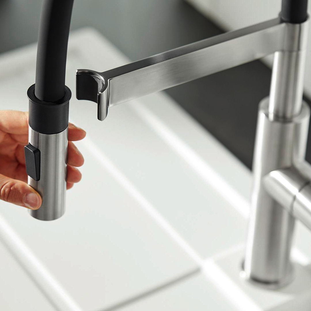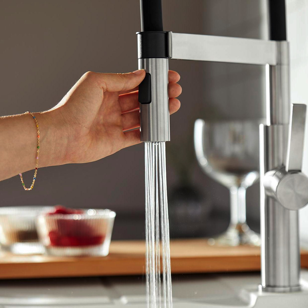 mit schwarzen Akzenten, Edelstahl massiv, Oberfläche gebürstet, flexibler Gummischlauch in schwarz, Zweistrahlbrause Perlstrahl/Brausestrahl, Arretierung der Brause durch präzise Magnethalterung, energiesparend (Grundeinstellung des Bedienhebels auf Kaltstart), 9 l/min bei 3 bar Druck, hoher Auslauf 360° schwenkbar, Hahnloch Ø 35 mm erforderlich, mit Keramik-Scheibenkartusche, patentierter Strahlregler für deutlich reduzierte Verkalkung, Brause aus Metall, magnetisierter Handbrausehalter, schwarzer Schlauch aus Silikon, flexible Anschlussrohre mit 700 mm Länge und 3/8" Mutter, Stabilisierungsplatte, Rückflussverhinderer gegen Rückfließen nach EN 1717