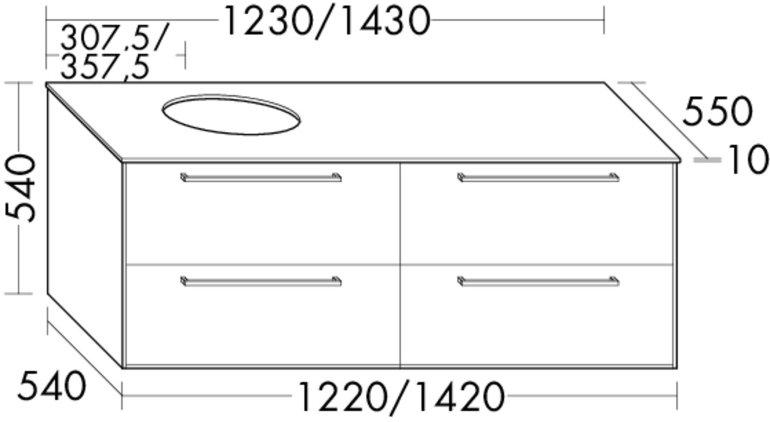 Front Thermo, mit Glasabdeckplatte, farbbeschichtet, 1 Siphonbohrung asymmetrisch, Waschtischunterschrank, 2 Schubladen oben mit Siphonausschnitt und 2 Auszüge unten