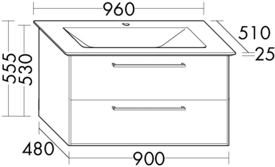 Mineralguss-Waschtisch: Muldentiefe: 120 mm, Beckenmaß 690 x 320 mm, Waschtischunterschrank: 1 Schublade oben mit Siphonausschnitt, 1 Auszug unten mit Raumsparsiphon