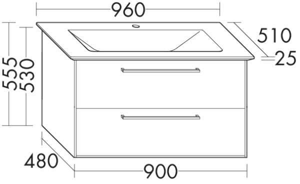 Mineralguss-Waschtisch: Muldentiefe: 120 mm, Beckenmaß 690 x 320 mm, Waschtischunterschrank: 1 Schublade oben mit Siphonausschnitt, 1 Auszug unten mit Raumsparsiphon