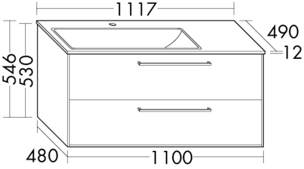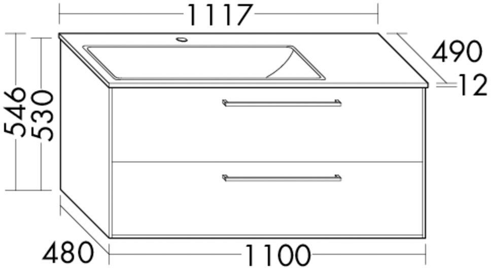 Keramik-Waschtisch, Muldentiefe: 120 mm, Beckenmaß 655x306 mm, Waschtischunterschrank, 1 Schublade oben mit Siphonausschnitt, 1 Auszug unten, mit Raumsparsiphon