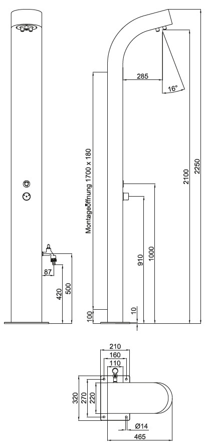 CONTI+ CONFREE Standbrause freistehend gebogen Edelstahl, elektrisch, Piezo-Taster, mit Düsenbrausekopf CONHEAD MAXI, mit Zapfhahn, Batteriebetrieb, Thermostat, DN15
