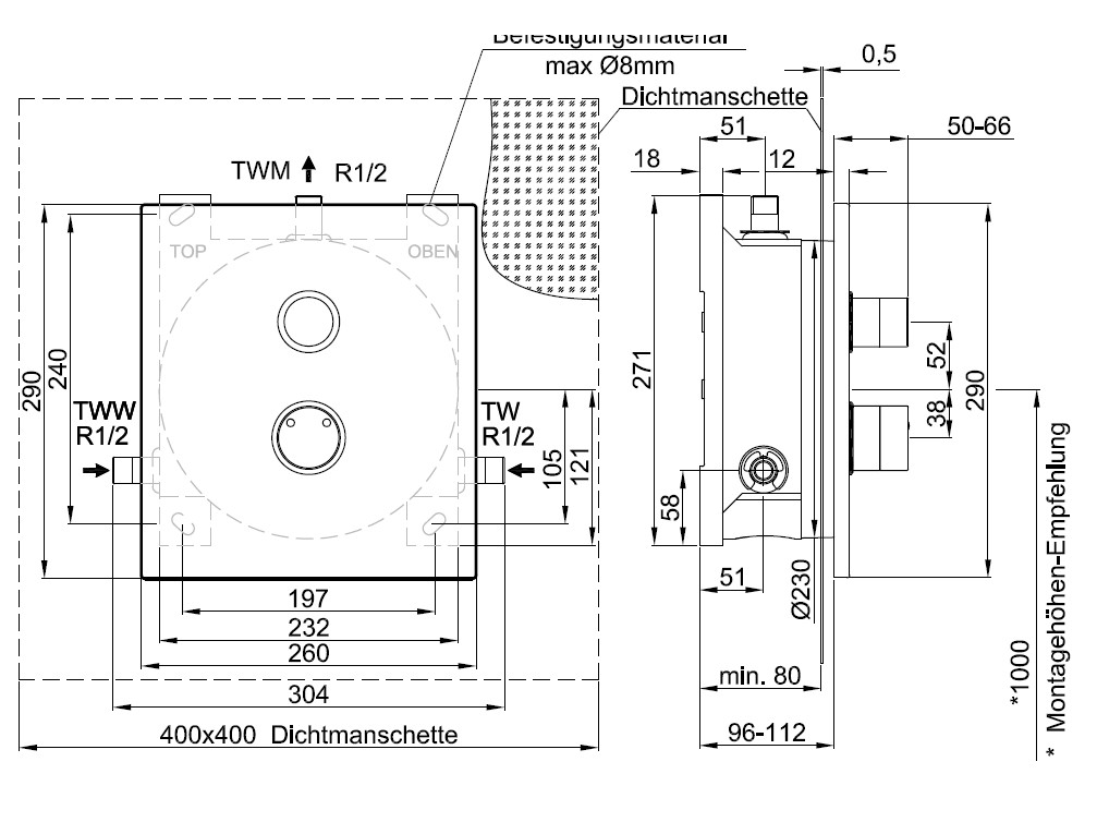 CONTI+ CONGENIAL Dusche Unterputz eckig Edelstahl, mechanisch, Auf-/Zu-Griff, Thermostat, DN15, FertigMontage-Set