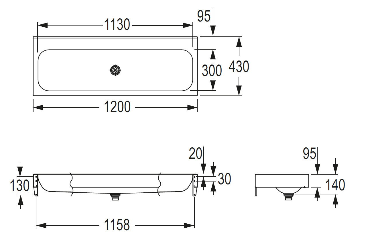 CONTI+ Waschrinne Fjord 1200 Edelstahl, OHNE Überlauf, 1200x430x140 mm, Edelstahl matt gebürstet