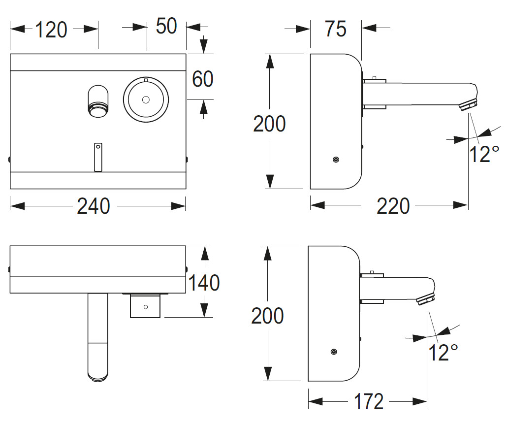 CONTI+ lino Wandarmatur AufPutz elektrisch, K30, Infrarot-Sensor, Netzgerät Unterputz, Thermostat, Ausladung 220 mm, Edelstahl, G3/8''