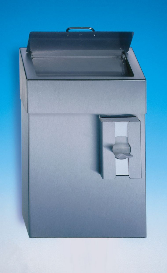 (H x B x T) 420 x 285 x 150 mm, Sichtflächen matt gebürstet, Hygienebeutelhalter an der Frontseite, Einwurfklappe mit Sichtblende, Haltebügel für Abfallbeutel aus Stahldraht, Hygienebehälter in Einzelverpackung mit Befestigungsmaterial (4 Dübel, 4 Schrauben und 4 U-Scheiben)