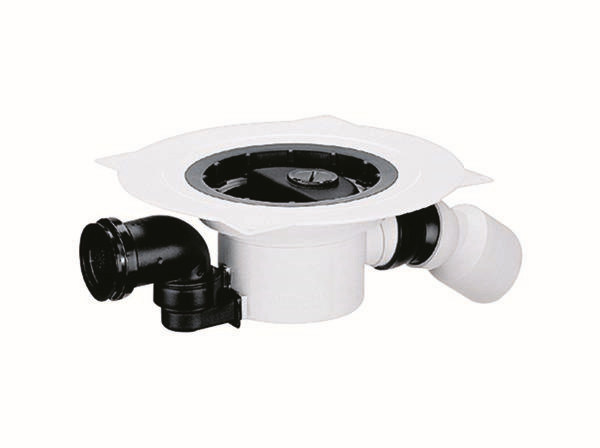 nach DIN EN 1253, Ablaufstutzen seitlich, mit Doppelkugelgelenk, verstellbar 0-55°, Geruchsverschluss, Sperrwasserhöhe 50 mm (gemäß DIN EN 1253), Reinigungsöffnung (ermöglicht den Zugang zu Geruchsverschluss und Ablaufstutzen), Bauschutzdeckel, Polypropylen, hochschlagfest