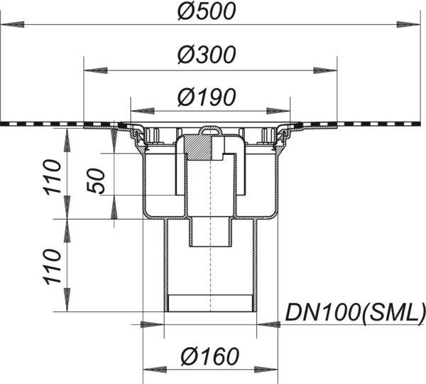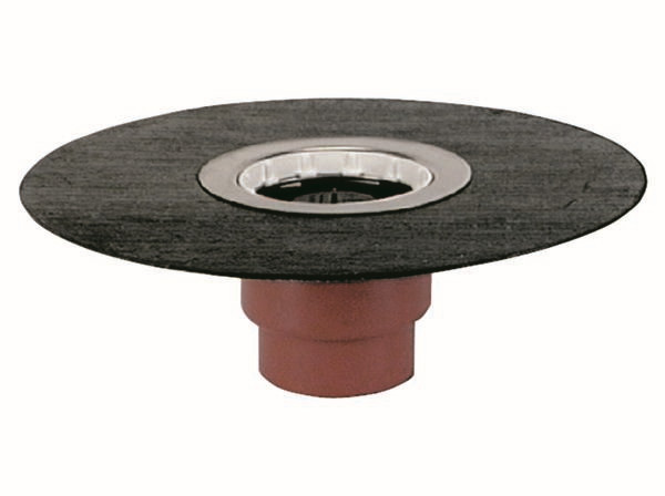 nach DIN EN 1253, Gehäuse mit werkseitig aufgeschweißter Bitumenschweißbahn-Manschette, Ø 500 mm, 5 mm stark, mit Edelstahlflansch zur zusätzlichen Sicherheit, Ablaufstutzen senkrecht, für den Anschluss von SML-Gussrohren, herausnehmbarer Geruchs- und Reinigungsverschluss, Sperrwasserhöhe 50 mm (gemäß DIN EN 1253), Bauschutzdeckel, Polypropylen, hochschlagfest
