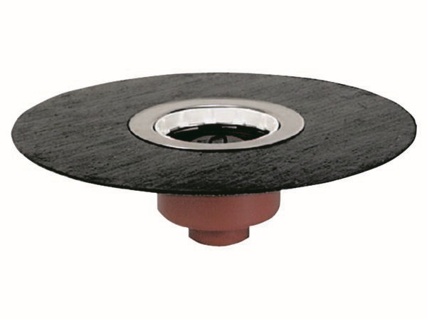 nach DIN EN 1253, Gehäuse mit werkseitig aufgeschweißter Bitumenschweißbahn-Manschette, Ø 500 mm, 5 mm stark, mit Edelstahlflansch zur zusätzlichen Sicherheit, Ablaufstutzen senkrecht, für den Anschluss von SML-Gussrohren, herausnehmbarer Geruchs- und Reinigungsverschluss, Sperrwasserhöhe 50 mm (gemäß DIN EN 1253), Bauschutzdeckel, Polypropylen, hochschlagfest