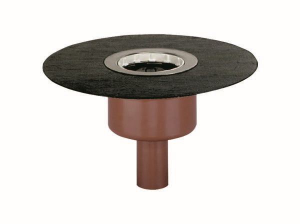 nach DIN EN 1253, Gehäuse mit werkseitig aufgeschweißter Bitumenschweißbahn-Manschette, Ø 500 mm, 5 mm stark, mit Edelstahlflansch zur zusätzlichen Sicherheit, Ablaufstutzen senkrecht, für den Anschluss von SML-Gussrohren, herausnehmbarer Geruchs- und Reinigungsverschluss, Sperrwasserhöhe 50 mm (gemäß DIN EN 1253), Bauschutzdeckel, Polypropylen, hochschlagfest