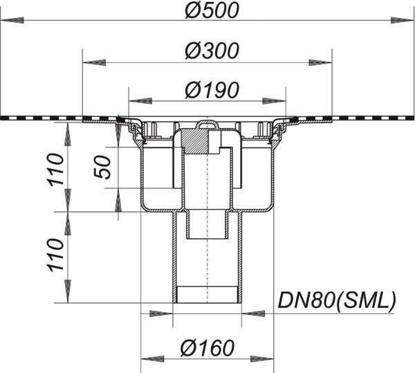 nach DIN EN 1253, Gehäuse mit werkseitig aufgeschweißter Bitumenschweißbahn-Manschette, Ø 500 mm, 5 mm stark, mit Edelstahlflansch zur zusätzlichen Sicherheit, Ablaufstutzen senkrecht, für den Anschluss von SML-Gussrohren, herausnehmbarer Geruchs- und Reinigungsverschluss, Sperrwasserhöhe 50 mm (gemäß DIN EN 1253), Bauschutzdeckel, Polypropylen, hochschlagfest