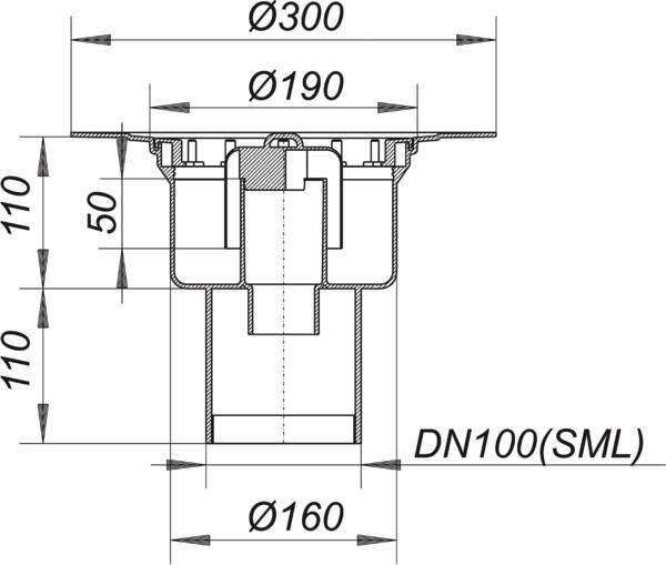nach DIN EN 1253, Ablaufstutzen senkrecht, für den Anschluss von SML-Gussrohren, herausnehmbarer Geruchs- und Reinigungsverschluss, Sperrwasserhöhe 50 mm (gemäß DIN EN 1253), Bauschutzdeckel, Polypropylen, hochschlagfest