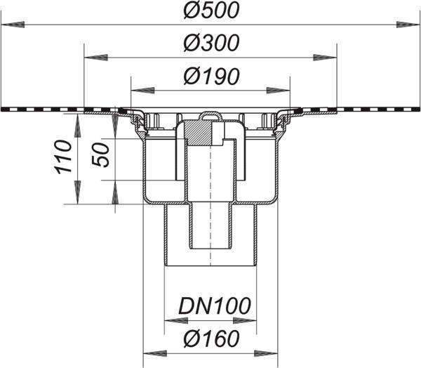 nach DIN EN 1253, Gehäuse mit werkseitig aufgeschweißter Bitumenschweißbahn-Manschette Ø 500 mm, 5 mm stark, mit Edelstahlflansch zur zusätzlichen Sicherheit, Ablaufstutzen senkrecht, für den Anschluss an Kunststoffrohre, Geruchs- und Reinigungsverschluss, Sperrwasserhöhe 50 mm (gemäß DIN EN 1253), Bauschutzdeckel, Polypropylen, hochschlagfest