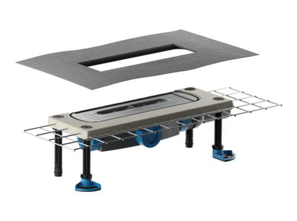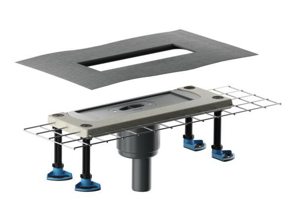 Bauhöhe 45 mm (ohne Montagefüße 30 mm), zum Einbau mit Duschrinnen CeraFloor, CeraWall, CeraFrame Individual, Zentrix, CeraNiveau und CeraFrame Liquid, Polymerbetonkragen mit eingegossener Baustahlmatte, flexible Dichtmanschette zum sicheren Anschluss an Verbundabdichtungen gemäß DIN 18534, vorgefertigter Randdämmstreifen, schallentkoppelte Montagefüße zur Fixierung und Höheneinstellung 45-240 mm, herausnehmbarer Geruchs- und Reinigungsverschluss, Sperrwasserhöhe 50 mm (gem. DIN EN 1253), Haarsieb (optional einsetzbar), Bauschutzabdeckung, Ablaufgehäuse und Ablaufstutzen aus Polypropylen, hochschlagfest