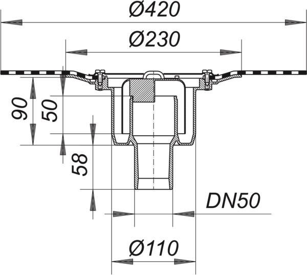 nach DIN EN 1253, Gehäuse mit werkseitig aufgeschweißter Bitumenschweißbahn Manschette, Ø 420, 5 mm stark, mit Edelstahlflansch zur zusätzlichen Sicherheit, Ablaufstutzen DN 50 senkrecht, herausnehmbarer Geruchs- und Reinigungsverschluss, Sperrwasserhöhe 50 mm (gemäß DIN EN 1253), Bauschutzdeckel, Polypropylen, hochschlagfest