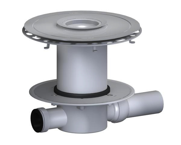 Ablaufstutzen DN 50 seitlich, mit Kugelgelenk, verstellbar von 0-15°, Zulauf DN 40, Montage- und Verstärkungsblech aus Edelstahl 1.4404, TistoDrain Aufstockelement N mit Vlies-kaschiertem Flansch, herausnehmbarer Geruchs- und Reinigungsverschluss, Sperrwasserhöhe 50 mm (gemäß DIN EN 1253), Gleitdichtung für Klebebettdicke 0-20 mm, Rückstaudichtung, Bauschutzdeckel/Montageschlüssel, Polypropylen, hochschlagfest
