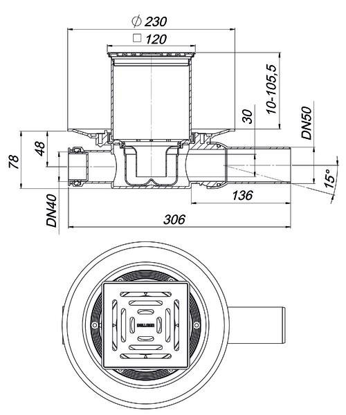 Ablaufstutzen DN 50 seitlich, mit Kugelgelenk, verstellbar von 0-15°, Zulauf DN 40, höhenverstellbarer Aufsatz E 12, herausnehmbarer Geruchs- und Reinigungsverschluss, Sperrwasserhöhe 30 mm (abweichend von DIN EN 1253), Bauschutzdeckel, Rahmen und Rost aus Edelstahl 1.4301, Belastungsklasse K 3 (300 kg)