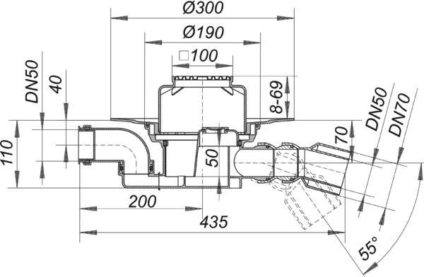 nach DIN EN 1253, Ablaufstutzen DN 50/DN 70 seitlich, mit Doppelkugelgelenk, verstellbar von 0-55°, höhenverstellbarer Aufsatz E 15, Geruchsverschluss, Sperrwasserhöhe 50 mm (gemäß DIN EN 1253), Reinigungsöffnung, Bauschutzdeckel, Polyprpylen, hochschlagfest, Rahmen Polypropylen, 100 x 100 mm, Rost Edelstahl 1.4301, Belastungsklasse K 3 (300 kg)