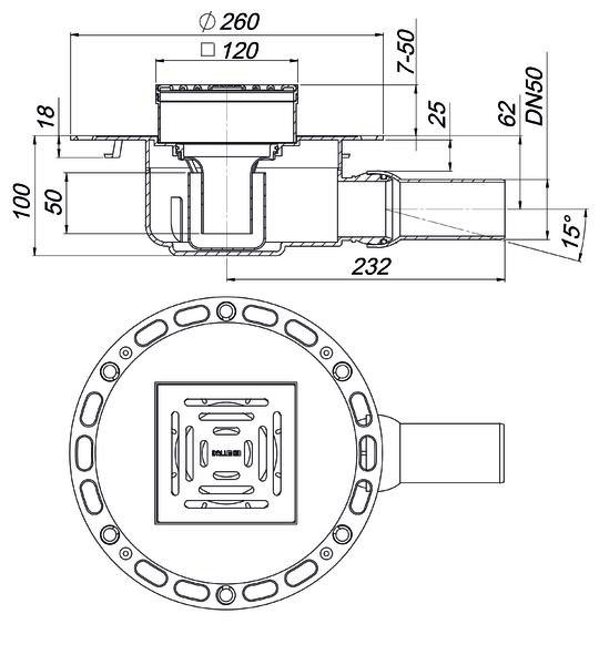 Dallmer Bodenablauf Circo V.1 120 x 120 mm, DN 50/70, Ablaufstutzen senkrecht