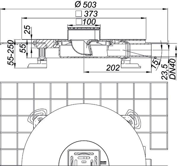 vorkonfektioniertes Set, mit Positionierhilfe, Aufsatz DallDrain Select mit Edelstahlrost im Edelstahlrahmen, Ablaufstutzen DN 40 seitlich, mit Kugelgelenk, verstellbar von 0-15°, Rost und Rahmen aus Edelstahl, Polymerbetonkragen mit eingegossener Baustahlmatte, flexible und einklickbare Dichtmanschette zum sicheren Anschluss an Verbundabdichtungen gem. DIN 18534, komplett herausnehmbarer Geruchs- und Reinigungsverschluss, mechanisch wirkend (abweichend von DIN EN 1253), Bauschutzabdeckung, vier schallentkoppelte Montagefüße zur Fixierung und Höheneinstellung 55-250 mm, Aufsatzverlängerung kürzbar für Bodenbeläge 10-36 mm (mit Kleber), Ablaufgehäuse und Ablaufstutzen Polypropylen, hochschlagfest, Rost Edelstahl 1.4301, Belastungsklasse K3 (300 kg), Aufsatzverlängerung ABS, Rahmen Edelstahl 1.4301, bestehend aus den Artikelnummern 517265 und 518439