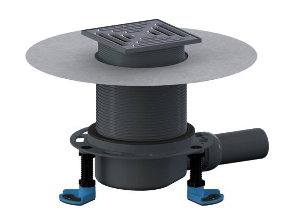 vorkonfektioniertes Set, mit Positionierhilfe, Bodenablauf mit Aufstockelement DallDrain Vario und Aufsatz DallDrain Pure mit Edelstahlrost im Kunststoffrahmen, Ablaufstutzen DN 50 seitlich, mit Kugelgelenk, verstellbar von 0-15°, Aufstockelement mit Rückstaudichtung, kürzbar 19-125 mm, integrierte Estrichverankerung, flexible und einklickbare Dichtmanschette zum sicheren Anschluss an Verbundabdichtungen gemäß DIN 18534, komplett herausnehmbarer, zweiteiliger Geruchs- und Reinigungsverschluss, Sperrwasserhöhe 50 mm (gemäß DIN EN 1253), Bauschutzdeckel, drei schallentkoppelte Montagefüße zur Fixierung und Höheneinstellung 101-372 mm, Aufsatzverlängerung kürzbar für Bodenbeläge 10-36 mm (mit Kleber), Ablaufgehäuse, Ablaufstutzen und Aufstockelement Polypropylen, hochschlagfest, Rost Edelstahl 1.4301, Belastungsklasse K 3 (300 kg), Aufsatzverlängerung und Rahmen aus ABS