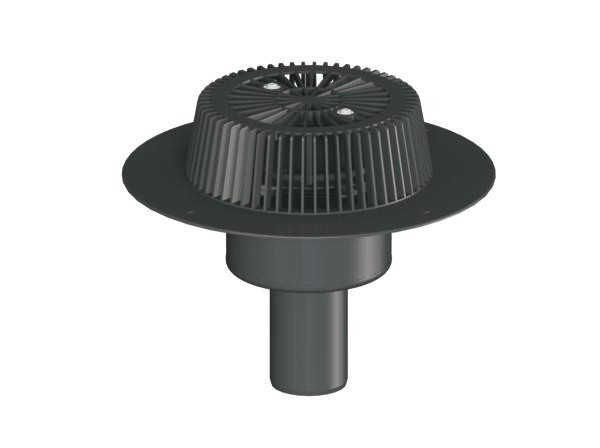 Ablaufleistungen nach DIN EN 1253, für den Einbau in Dachentwässerungsanlagen mit Druckströmung, Ablaufgehäuse wärmegedämmt, Ablaufstutzen senkrecht, Super-Drain-Einsatz, Laubfangkorb, verschraubt, mit extra breitem Flansch zum Anschluss von FPO-PP-Dachbahnen bzw. PE-Dampfsperrbahnen, Polypropylen, UV-stabilisiert