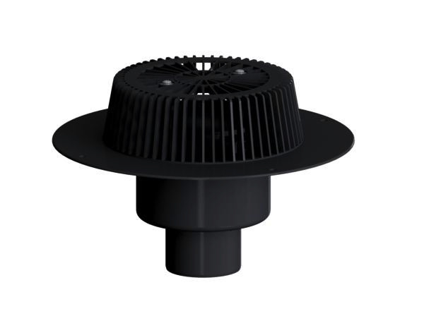 Ablaufleistungen nach DIN EN 1253, für den Einbau in Dachentwässerungsanlagen mit Druckströmung, Ablaufgehäuse wärmegedämmt, Ablaufstutzen senkrecht, Super-Drain-Einsatz, Laubfangkorb, verschraubt, mit extra breitem Flansch zum Anschluss von FPO-PP-Dachbahnen bzw. PE-Dampfsperrbahnen, Polypropylen, UV-stabilisiert
