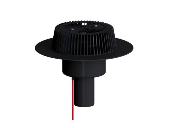 Ablaufleistungen nach DIN EN 1253, für den Einbau in Dachentwässerungsanlagen mit Druckströmung, Ablaufgehäuse wärmegedämmt, Ablaufstutzen senkrecht, Super-Drain-Einsatz, Laubfangkorb, verschraubt, extra breitem Flansch zum Anschluss von FPO-PP-Dachbahnen bzw. PE-Dampfsperrbahnen, Polypropylen, UV-stabilisiert, Direktanschluss an 230 V, Heizband nach VDE 0721, Teil 1/3.78 geprüft, Leistungsaufnahme pro Dachablauf 15 W, Rechnungswert für Absicherung pro Dachablauf 0,06 Ampere, empfohlene Absicherung pro Dachanlage 16 Ampere