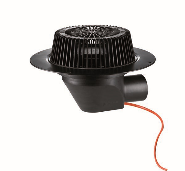 Ablaufleistungen nach DIN EN 1253, für den Einbau in Dachentwässerungsanlagen mit Druckströmung, Ablaufgehäuse wärmegedämmt, Ablaufstutzen DN 70 seitlich, 3° abgewinkelt, Super-Drain-Einsatz, Laubfangkorb, verschraubt, Polypropylen, UV-stabilisiert, mit Edelstahl-Flanschring zur Befestigung von polymeren Dachdichtungsbahnen, Direktanschluss an 230 V, Heizband nach VDE 0721, Teil 1/3.78 geprüft, Leistungsaufnahme pro Dachablauf 15 W, Rechnungswert für Absicherung pro Dachablauf 0,06 Ampere, empfohlene Absicherung pro Dachanlage 16 Ampere