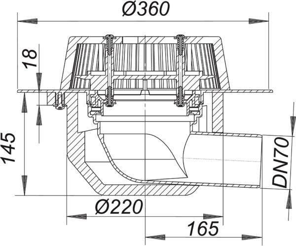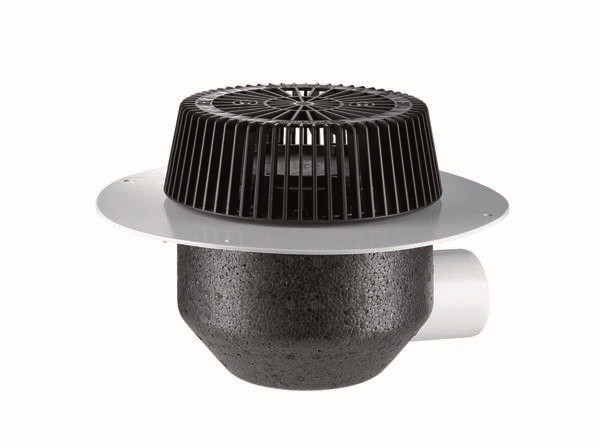 Ablaufleistungen nach DIN EN 1253, für den Einbau in Dachentwässerungsanlagen mit Druckströmung, Ablaufgehäuse wärmegedämmt, Ablaufstutzen DN 70 seitlich, 3° abgewinkelt, Super-Drain-Einsatz, Laubfangkorb, verschraubt, extra breitem Flansch zum Anschluss von PVC-Dachbahnen, aus PVC